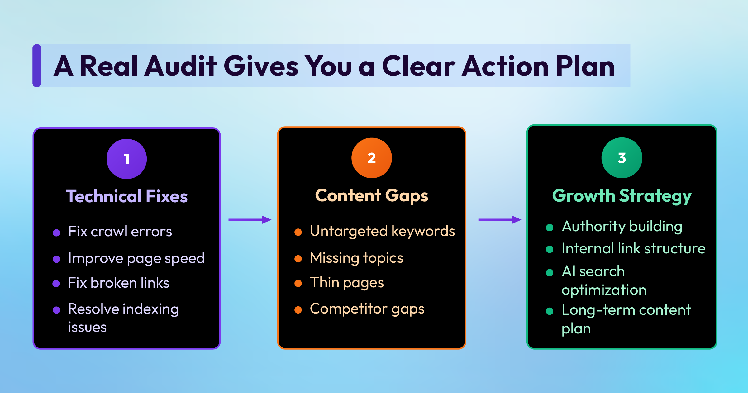 A proper SEO audit does not simply identify problems. It organizes them into a clear action plan, typically including: