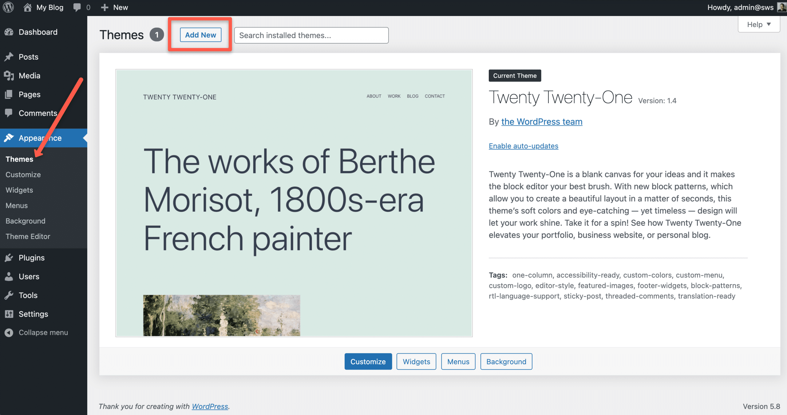 - Go to Appearance → Themes → Add New in your WordPress admin.