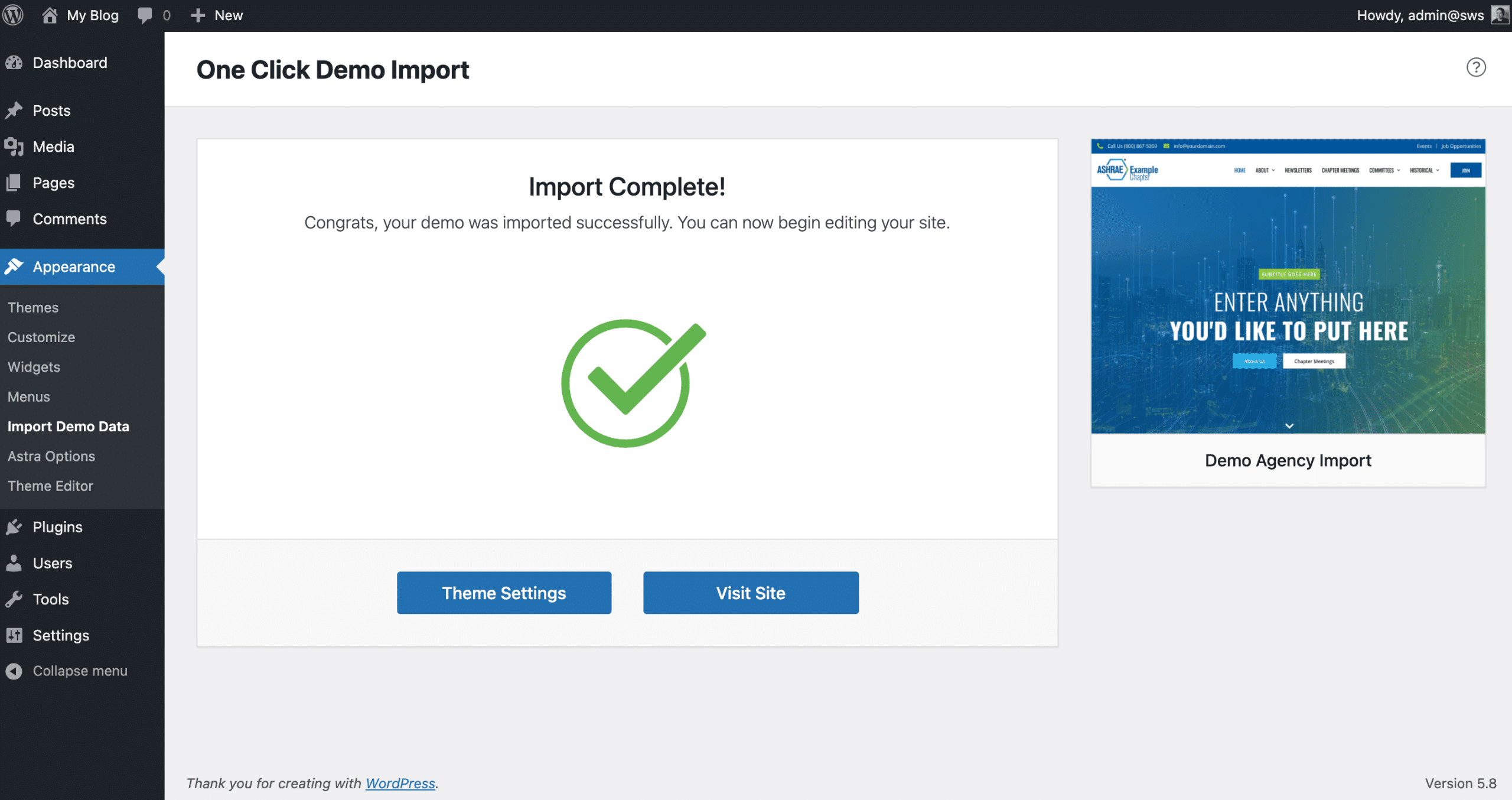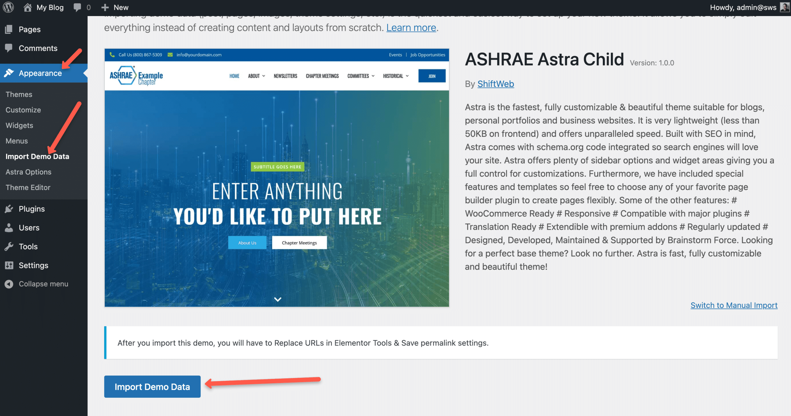 - Go to Appearance → Import Demo Data → Import Demo Data.