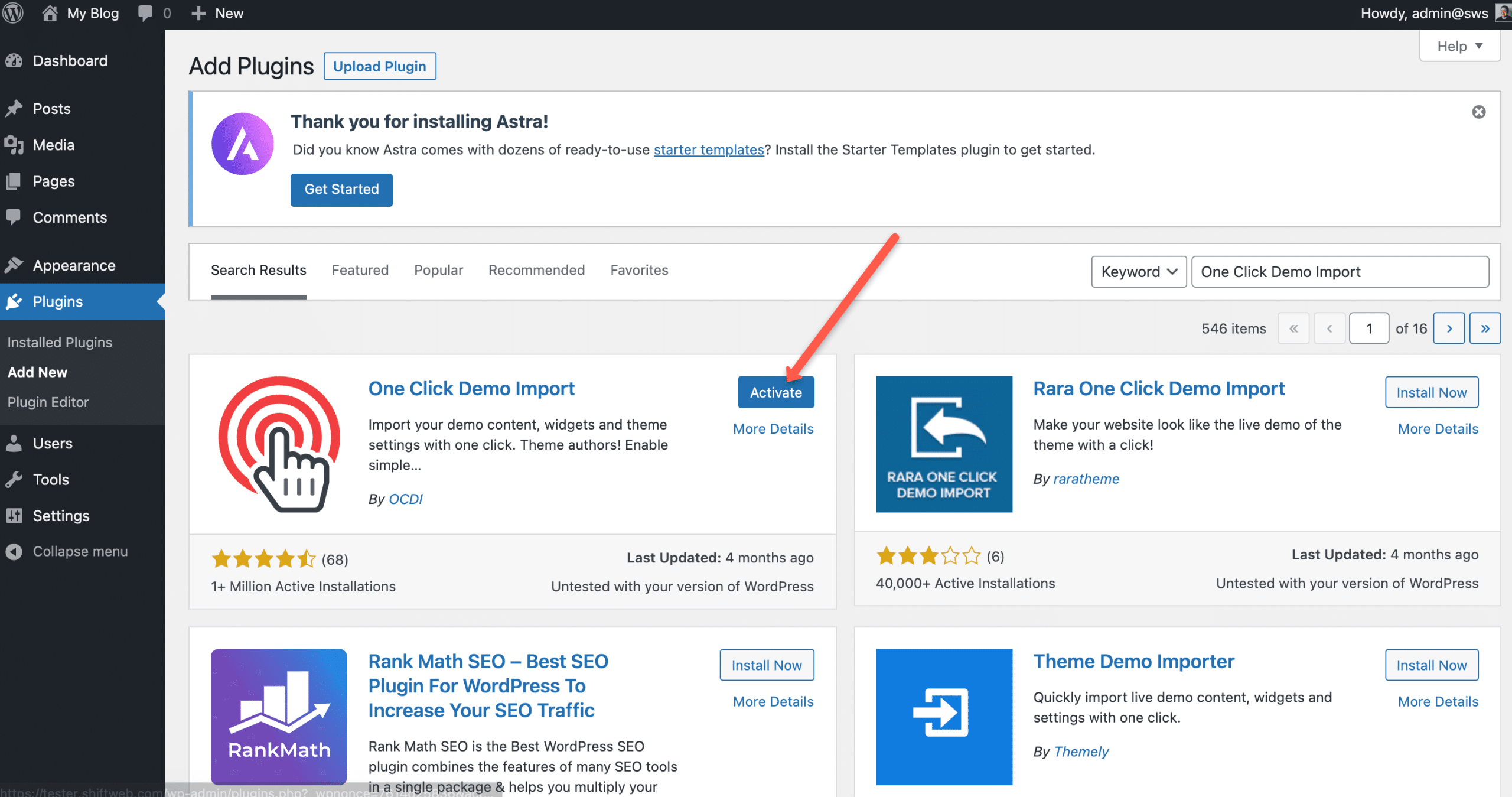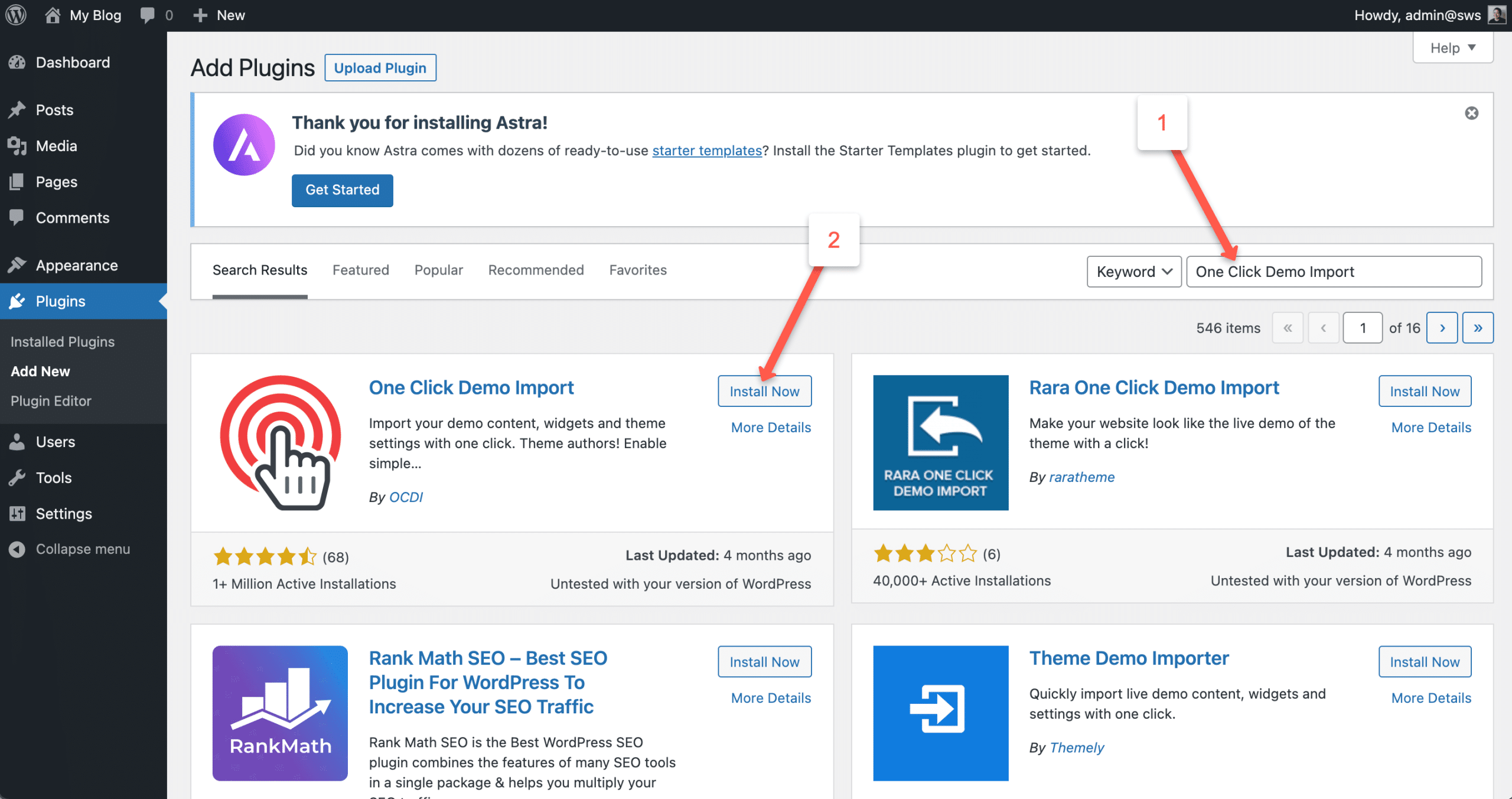 - Search for “One Click Demo Import” in the plugin search box.