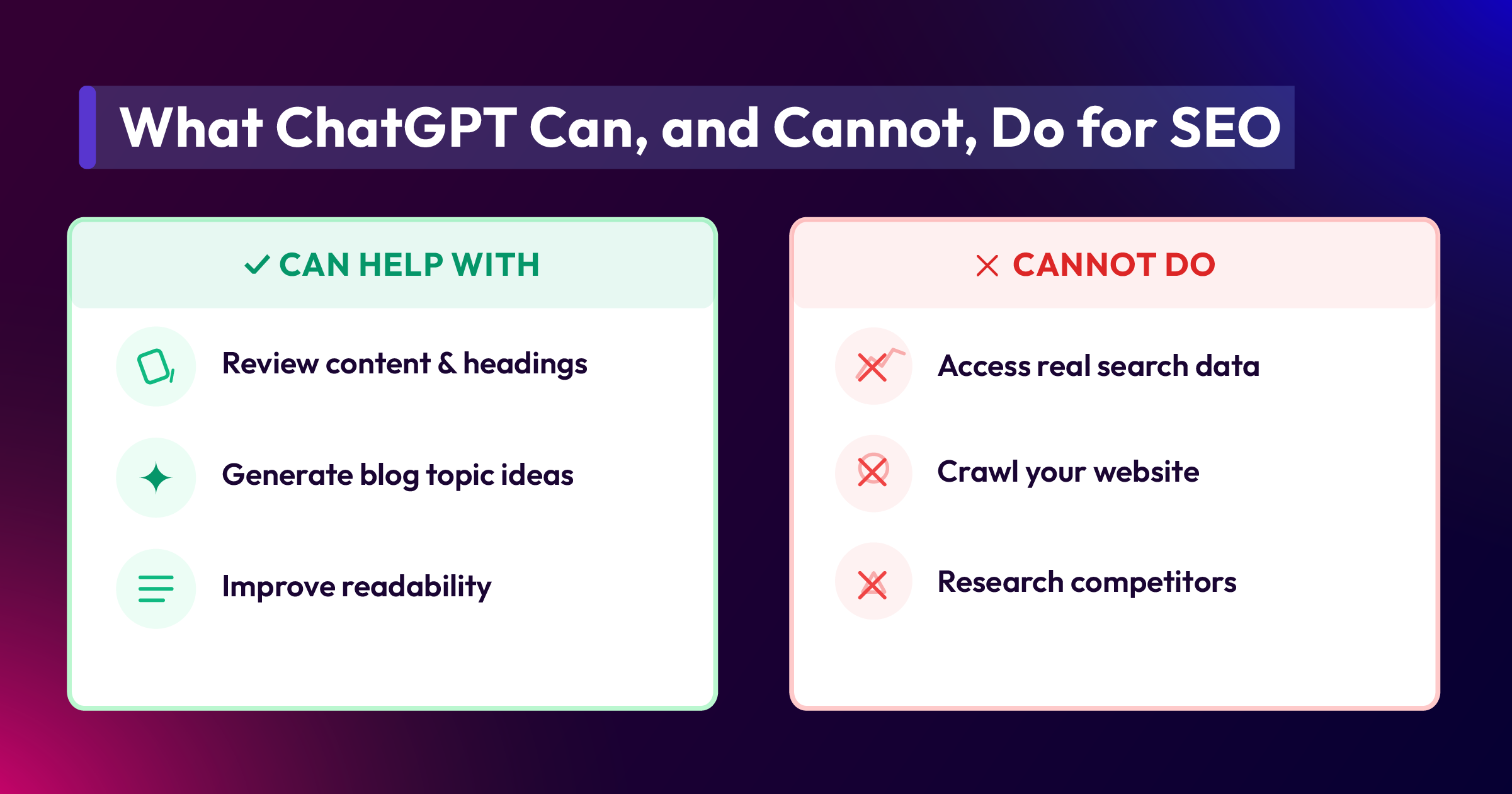 While ChatGPT is useful for content review, it has major limitations when it comes to real SEO analysis.