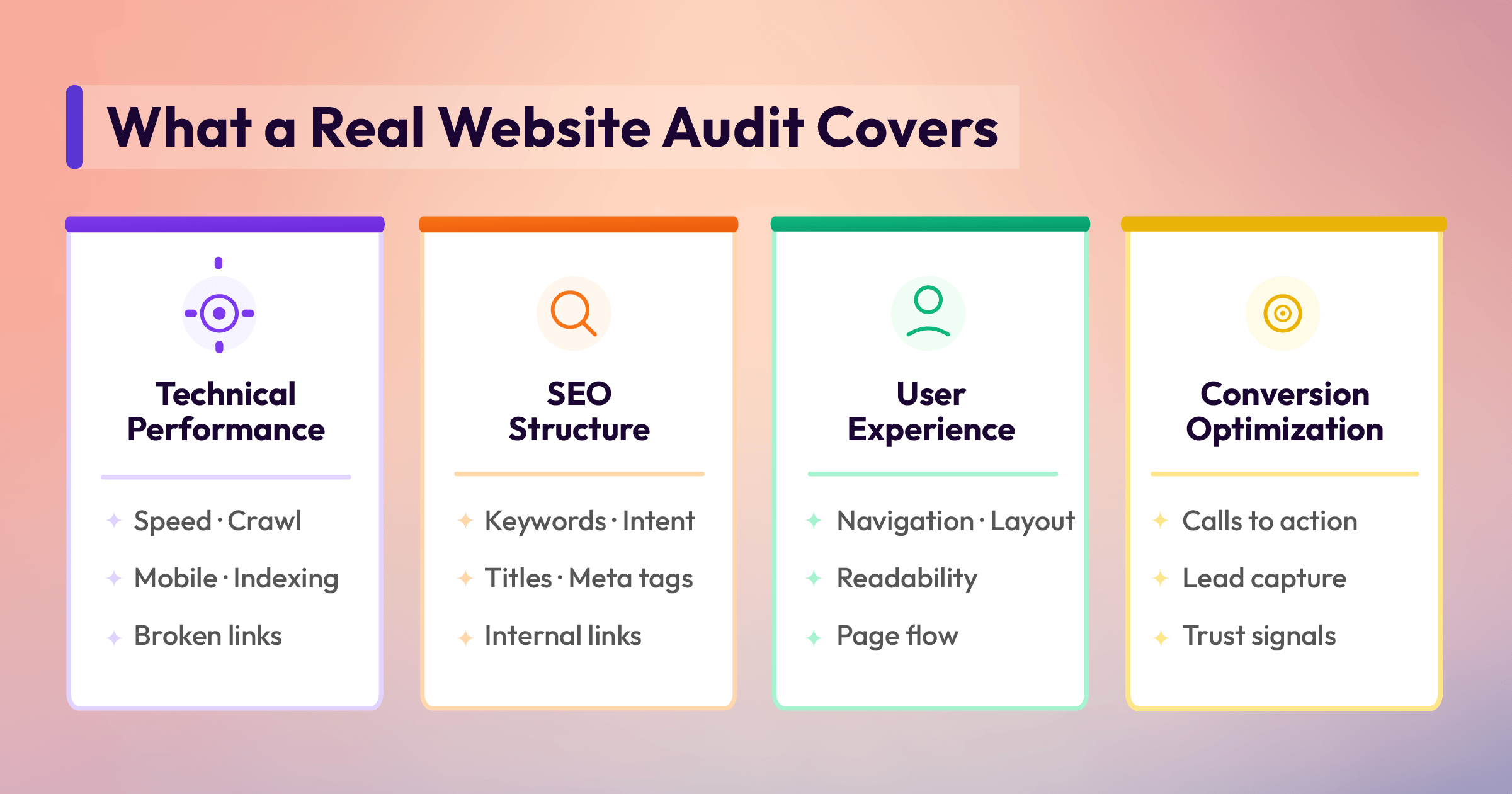 A proper audit looks at how these pieces work together to influence traffic, engagement, and conversions.