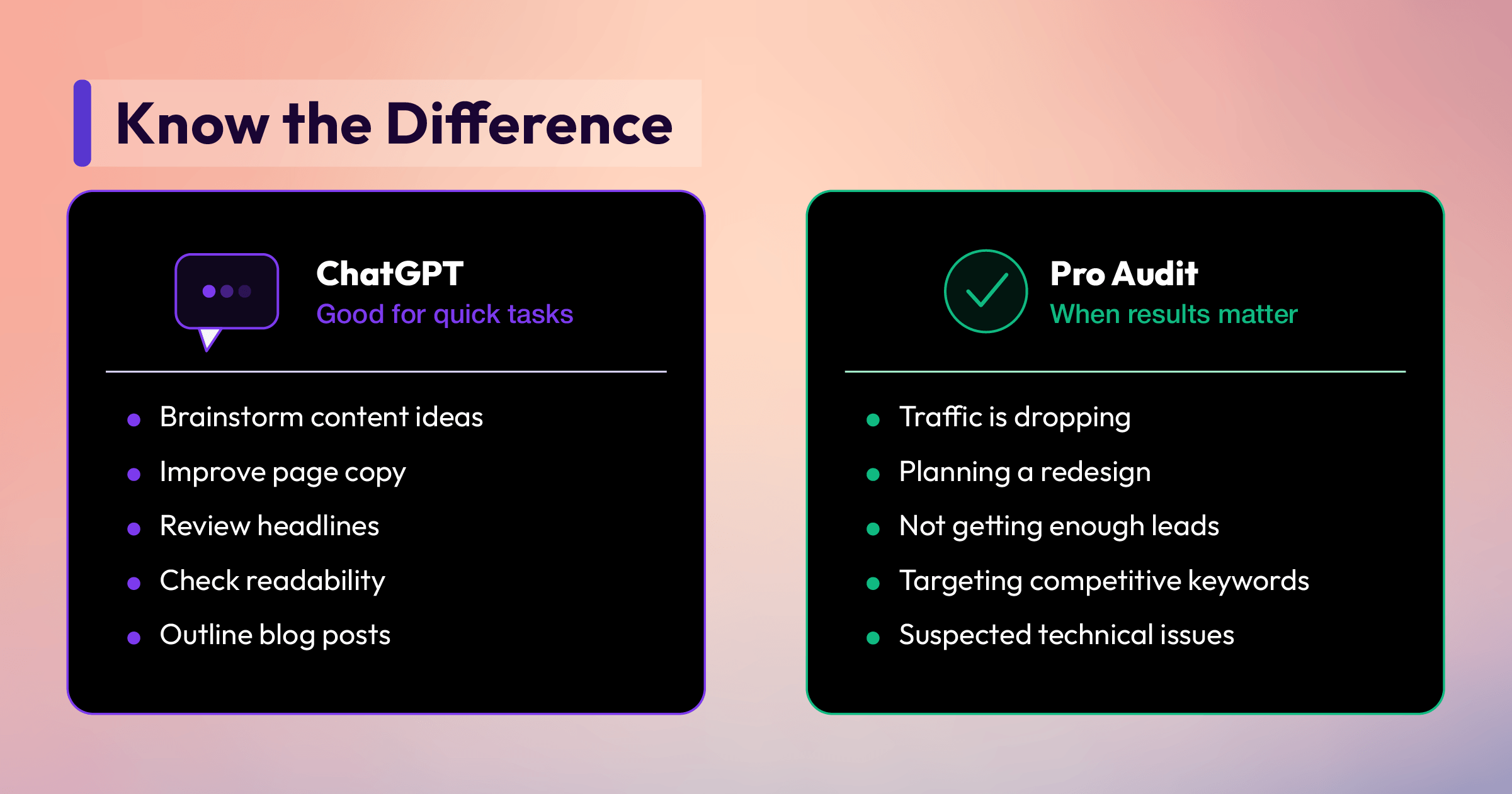But can ChatGPT actually do website audits? Well, it can help with parts of it, but its insights are limited and often too general to drive meaningful results.