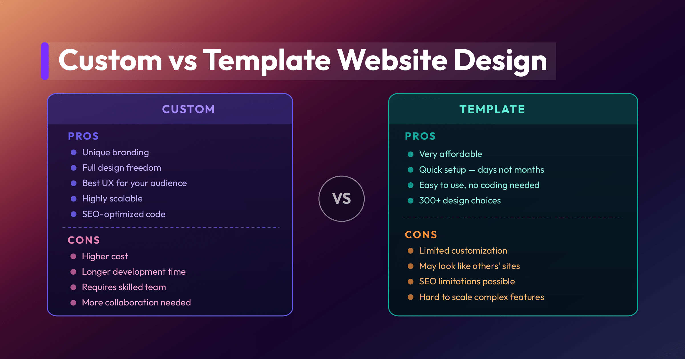 - Custom websites offer complete flexibility and control over design and functionality, but require more time, resources, and technical expertise to come to life.