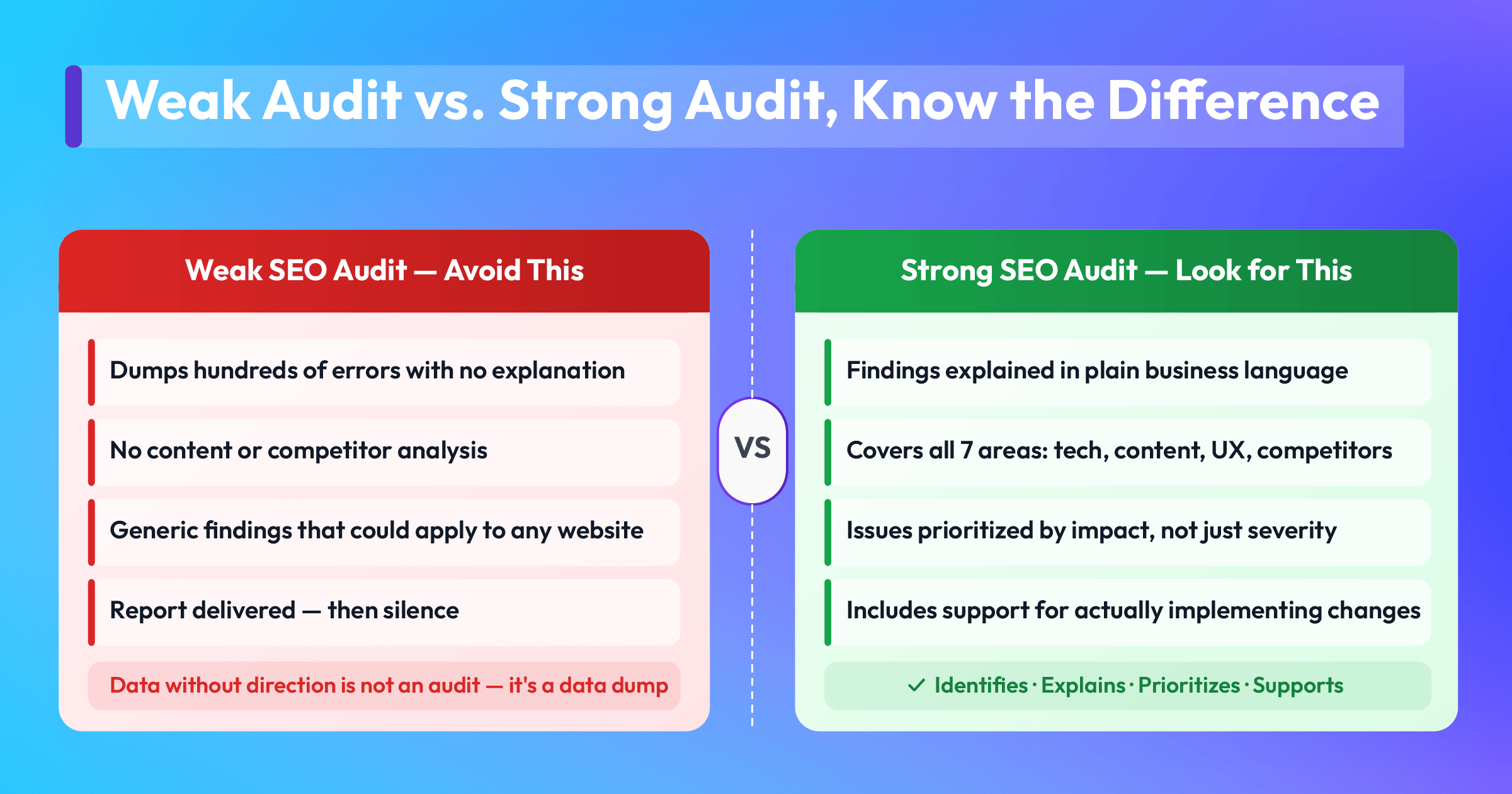 Equally important is clarity. The audit should translate technical findings into understandable explanations so business owners know what each issue means and why it matters.