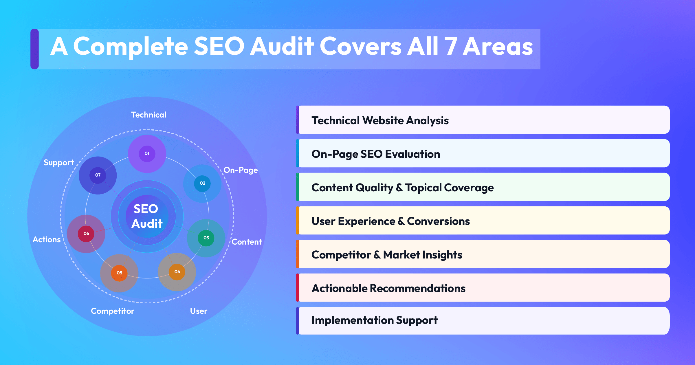 A strong audit should analyze technical performance, page optimization, content quality, user experience, and competitive positioning while providing clear and actionable recommendations.