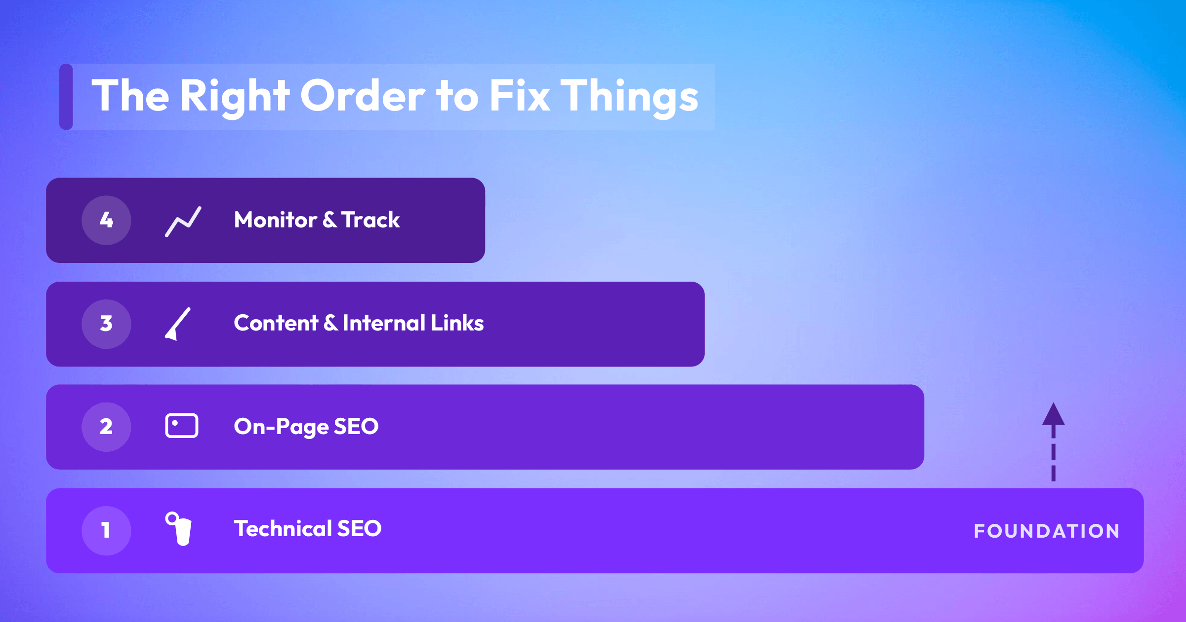Starting with technical barriers ensures search engines can properly access your website before you invest time in other improvements.